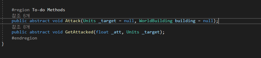 유닛들의 Attack()함수에 유닛 혹은 빌딩 두 개 다 들어가게 할려고 일반화를 사용할려고 했으나, 서로 성질이 다른 부모들이어서 내가 짜 놓은 구조에는 일반화로 구현하기가 힘들었다. 그래서 방법을 계속 생각해봤고 마침내 정리를 할 수 있었다.