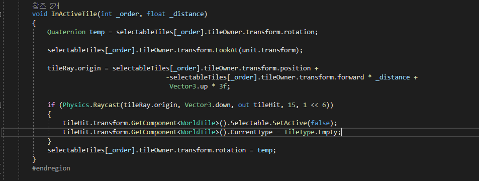 다른 것은 다 되는데 transform.LookAt() 괄호 안에 transform을 넣어야 했기 때문에 방법을 계속 찾다가 해결을 못하고 마무리를 한 것이 저 상태이다. (인터페이스 활용했으면 더더욱 깔끔했을 텐데 아쉬웠다..)