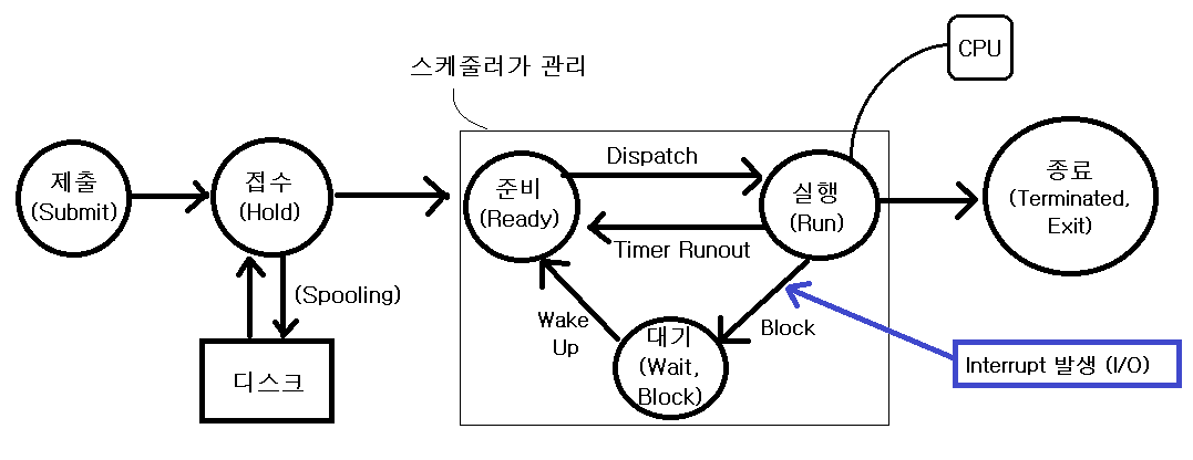 | Wake Up | 실행중인 프로세스가 완료되어 대기 중인 프로세스를 준비 상태로 전이하는것 (대기 -> 준비) |