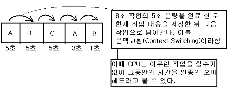 A작업이 8초 걸리는 작업, B작업이 6초 걸리는 작업, C 작업이 5초 걸리는 작업일때, 각 작업의 시간할당량(Time Slice)이 5초일 경우