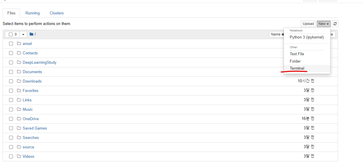 1. 쥬피터 노트북에서 new - Terminal를 통해 터미널을 띄운다