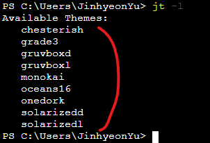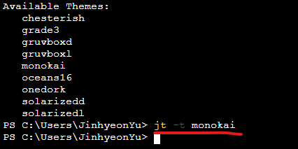 4. jt -t [원하는 테마명] 을 입력하면 테마를 바꿀 수 있다.