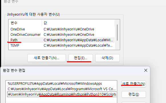 나의 경우는 JinhyeonYu 즉 시스템 경로가아니라 로컬 문서로 시작하기 때문에 로컬에 대한 사용자 변수에다가 추가했다.