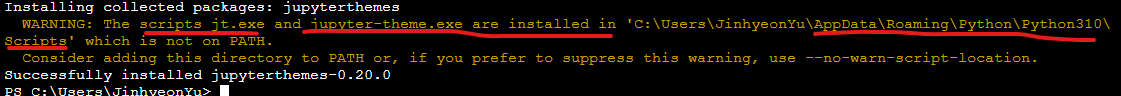 관리자 권한으로 실행했을 때(경로가 바뀌기 때문) jt.exe나 jupyter.theme.exe가 필요하다면 시스템 환경변수에도 추가할 예정이다.