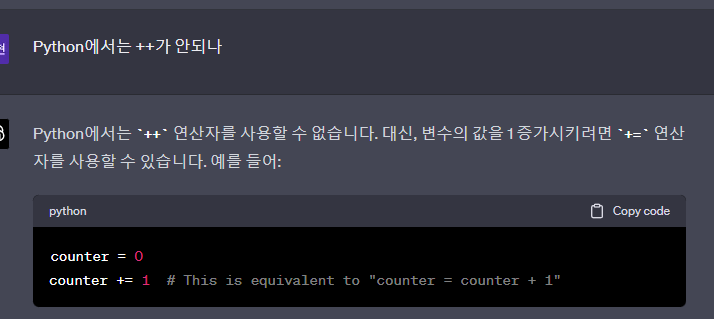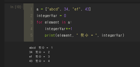 오? 파이썬에서는 ++연산자를 사용할수 없다고한다. 그래서 횟수를 카운팅할때는 아래와 같이 해야겠다.