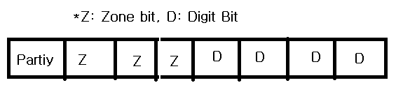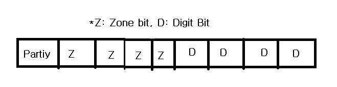 IBM에서 제작한 방식. 2진화 10진 코드로 불린다. 6비트로 구성되어있고 영소문자 사용이 안되며, 수치 계산용으로 사용된다. - Zonebit 2개, DigitBit 4개, (2^6 = 64가지 표현 가능) ![]() |