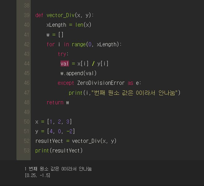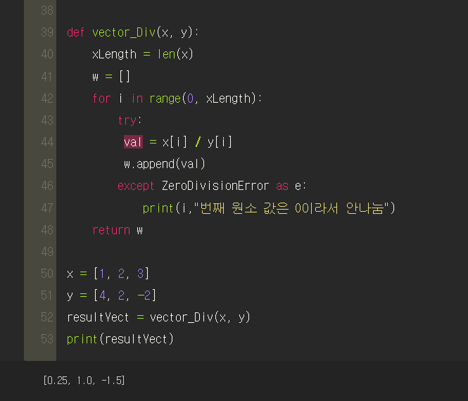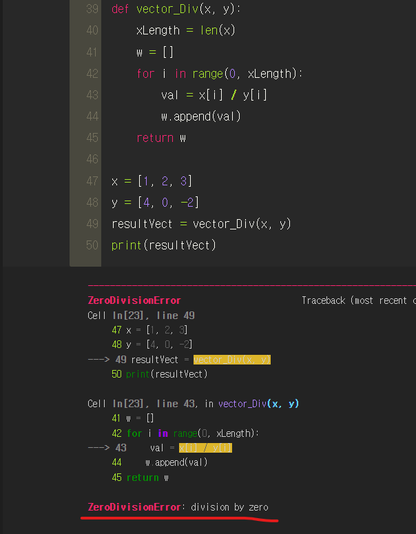 벡터 나눗셈 구현 중 신기한 것을 발견했다. 파이썬에서는 정상적이지 않은 연산은 에러를 뱉어낸다고한다 예를 들어 정수를 0으로 나눈다는 것은 정상적이지 않기 떄문에 에러를 뱉어냈다.