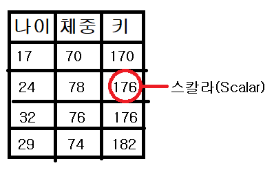위 데이터들의 집합은 데이터 셋(Data set)이라고 한다. 데이터 셋을 구성하는 하나의 구성 원소[숫자] 하나하나가 스칼라이다. 이때 데이터의 특성(Feature)은 나이, 체중, 키가 된다.