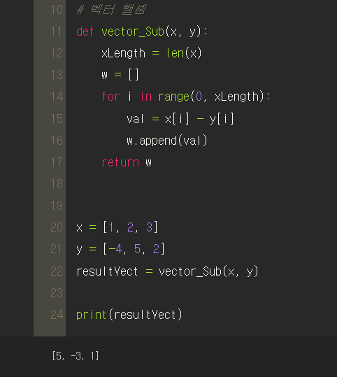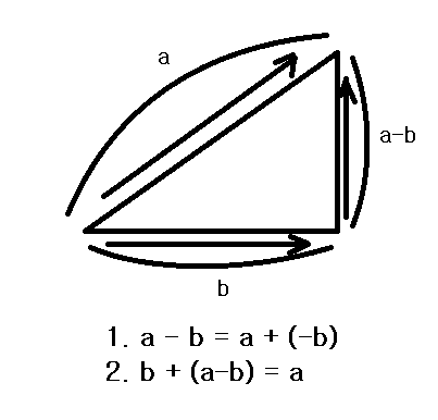 a = 1, 2, 3이고 b = 4, 5, 6 일때 a-b = (1-4, 2-5, 3-6) 즉 (-3, -3, -3)이다.