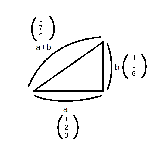 a+b = (1+4, 2+5, 3+6)인 (5, 7, 9)가 된다. 아래와 같은 그림은 b의 시작지점이 a의 종료지점과 동일 시 시켰을 떄이다.