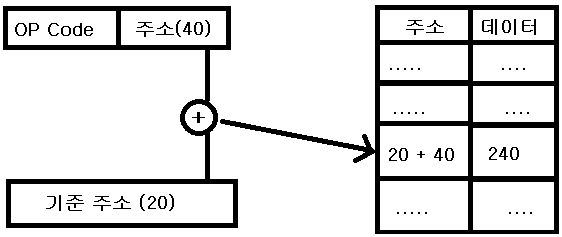 기준 주소를 기준으로 하여 상대적으로 얼만큼 떨어져 있는지 변위(Offset)로 표현하는 주소. - 절대 주소로 변환이 필요하다. ![]() (ex) 기준 주소 (20)에서 40 만큼 떨어져 있는 절대 주소 60을 지정한다. |