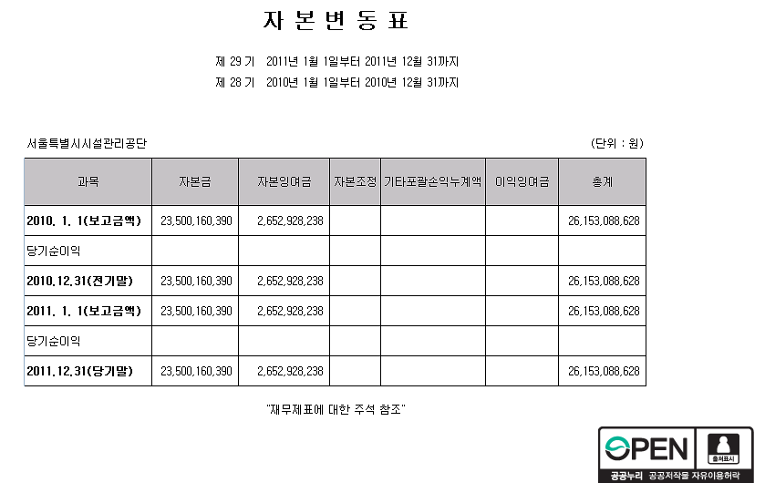말그대로 자본이 변동한 것을 나타내는 표이다. 위 예시들이랑 비슷하게 생겼다. 여기서 말하는 자본은 재무상태표의