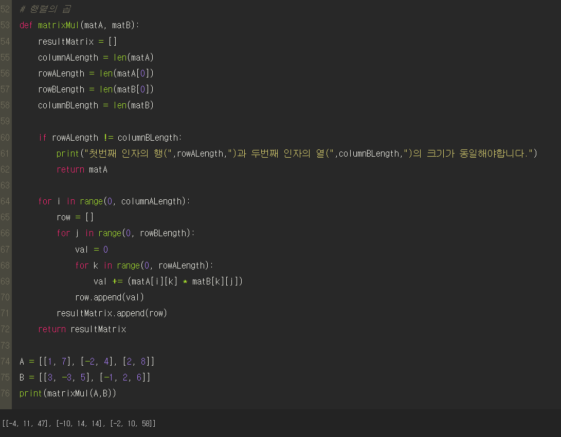 그리고 결과값이 들어갈 원소 인덱스 자리는 각각 A의 행과 B의 열을 기준이 되는 인덱스가 된다.