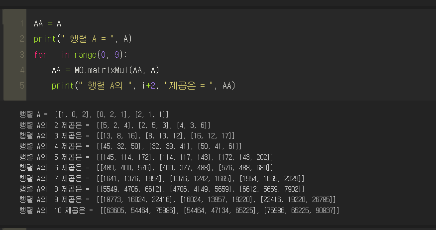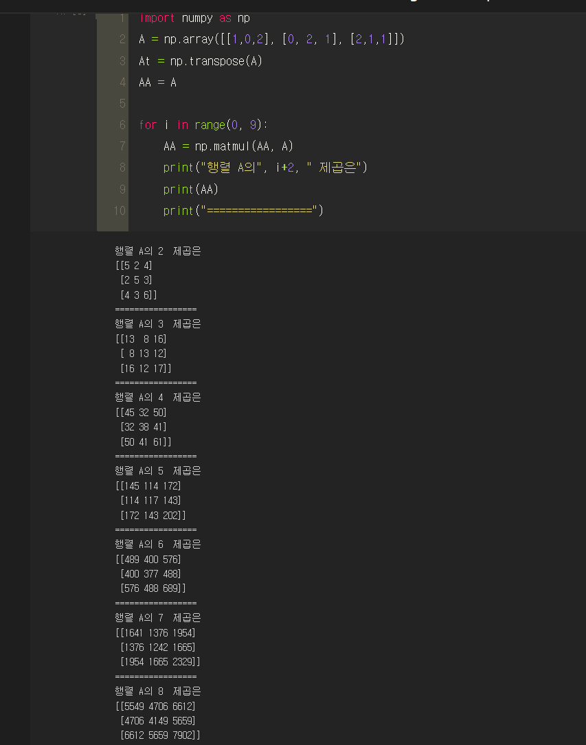위 도출된 결과를 보기 쉽게 표시했다. 대칭행렬의 거듭제곱은, 기준행렬과 전치행렬이 동일한, 대칭행렬이 나온다는 것을 확인할 수 있다.