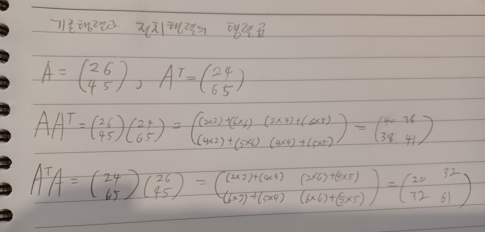 | 기존 행렬과 전치행렬의 행렬 곱 = 대칭행렬 (A t * A, A * A t) |