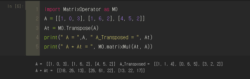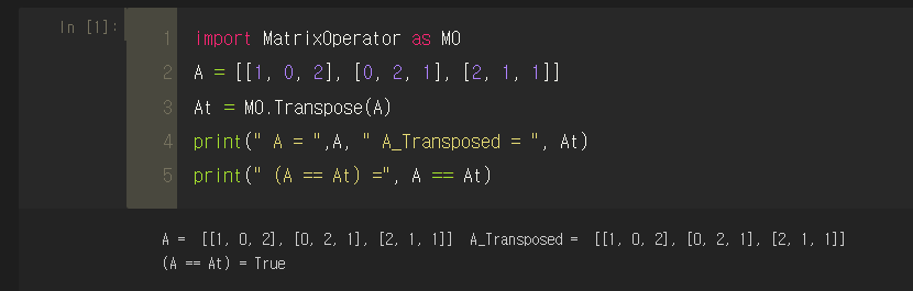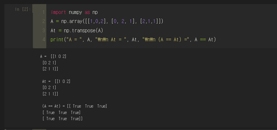 넘파이 라이브러리를 활용해 대칭 행렬의 전치 행렬은 동일한 값이 나온다는 것을 확인할 수 있다.