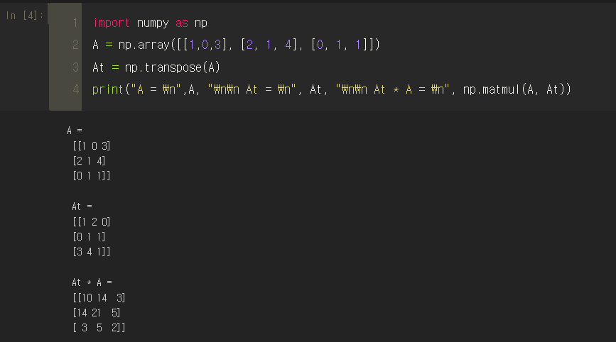 대칭 행렬이 아닌 A와 그의 전치행렬 At를 행렬 곱 한다면 대칭 행렬이 나오는 것을 넘파이를 활용한 행렬 곱에서도