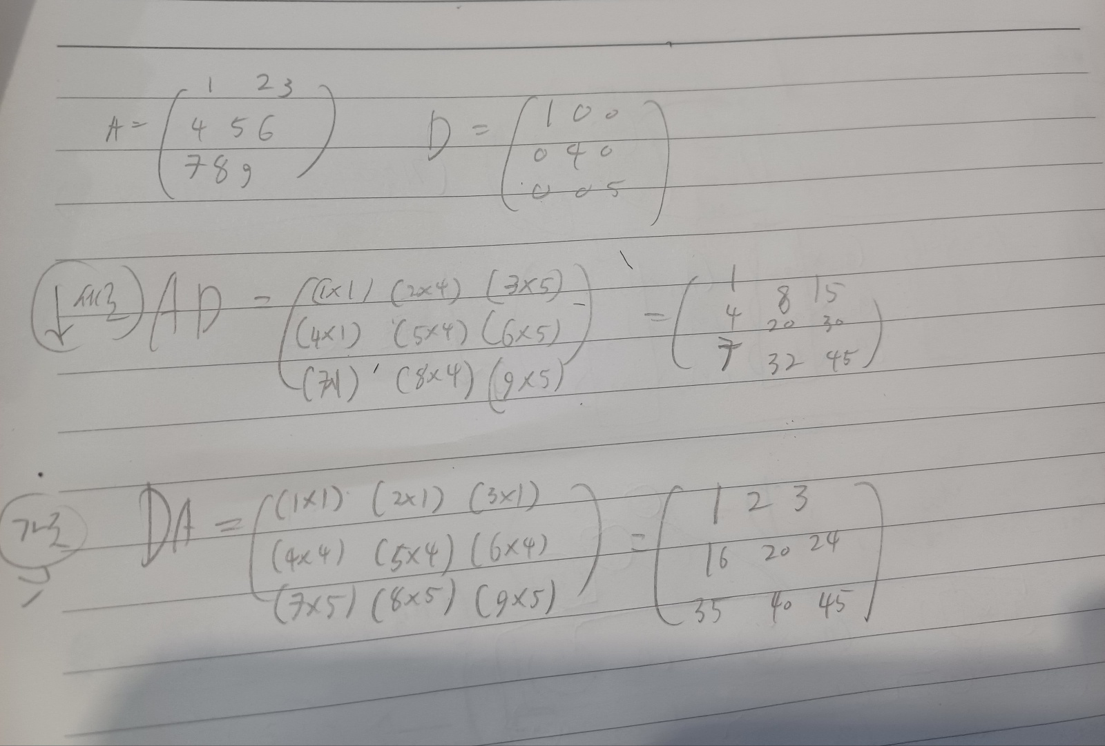 (1) AD [대각 행렬이 뒷편에 위치] 일경우 대각행렬의 주 대각 원소들을 각 행에 위치한 기준 행렬의 원소들을 곱해주면 된다. 예를 들어 D11은 A11, A21, A31.. 을 곱해주면 되는 것이고 D22는 A12, A22, A32...를 곱해주면 된다.