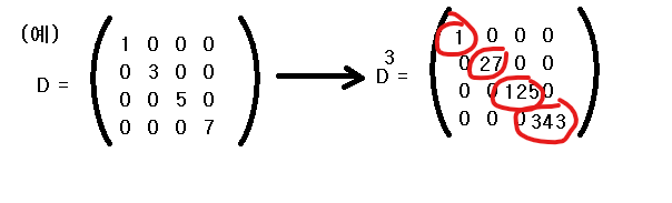대각 행렬의 거듭 제곱은 위와 같이 원소에 거듭 제곱을 해주는 것이다.