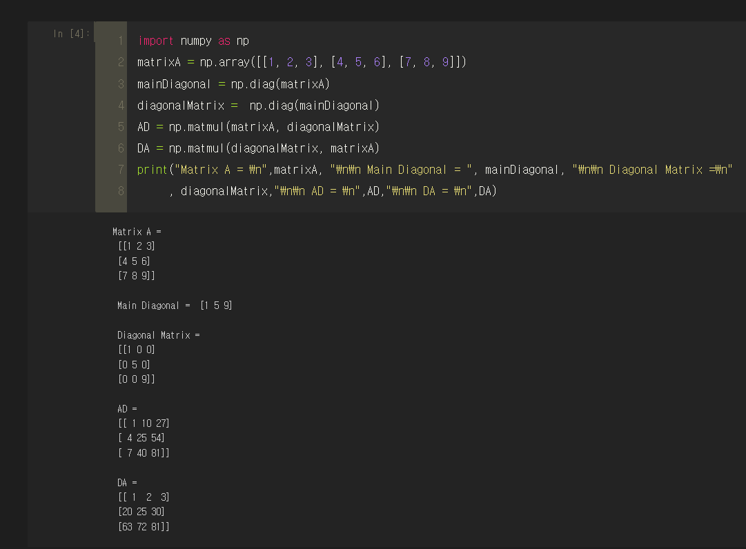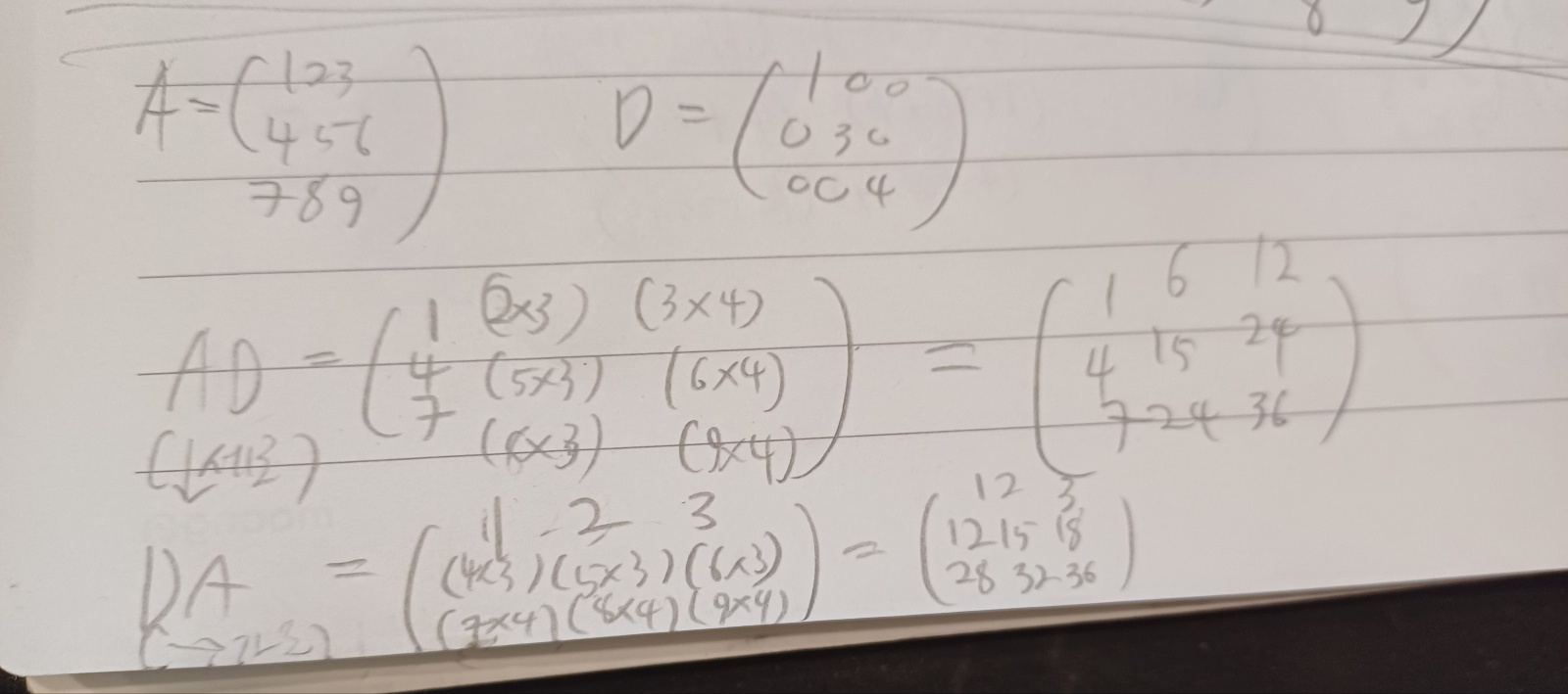 (2) DA [대각 행렬이 앞쪽에 위치] 일 경우 대각행렬의 주 대각 원소들은 각 열에 위치한 기준 행렬의 원소들을 곱해주면 된다. 예를 들어 D11은 A11, A12, A13을 곱해주고 D22는 A21, A22, A23을 곱해주고 D33은 A31, A32, A33을 곱해준다.