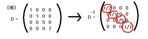 대각 행렬의 역행렬은 D^-1로 표기한다. 0이 아닌 주 대각 원소들의 값들이 분모가되고 분자가 1이 되는 분수가된다.