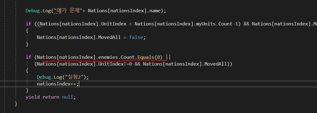 2. 아까 Diplomacy.cs에서 볼 수 있었듯이 모든 AI 국가의 적국은 랜덤 확률로 지정이 된다.만약에 적이 0일 경우의 예외 처리를 안 해줘서 매 플레이가 일정하지 않게 계속 중간에 nationsIndex++가 실행되지 않았었다.