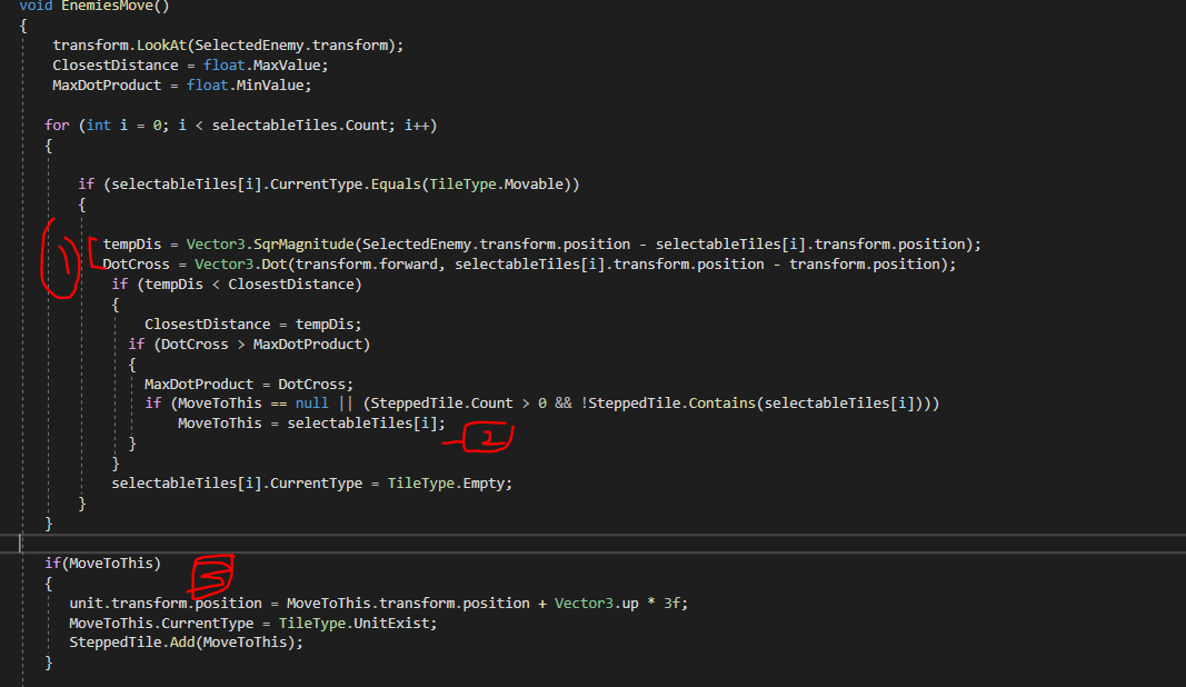 1,2. 각 타일들과 목표지점과의 거리들을 차례대로 먼저 SqrMagnitude로 비교를 하면서 내적을 이용하여 가장 정면 쪽에 있는 타일들을 골라내어 목표 지점으로 설정한다.