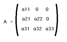 주 대각 원소 위쪽에 위치한 모든 원소들이 0인 행렬. 삼각형 형태로 아래 방향으로 향하고 있다.