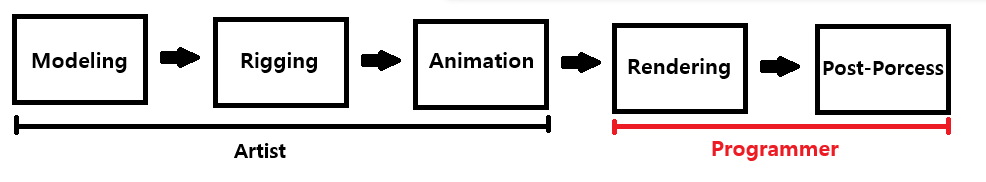 모델링, 리깅, 애니메이션은 주로 아티스트의 분야이고 내가 공부하고자 하는 렌더링, 포스트프로세싱, 런타임-애니메이션은 프로그래머 분야이다.
