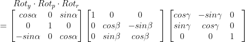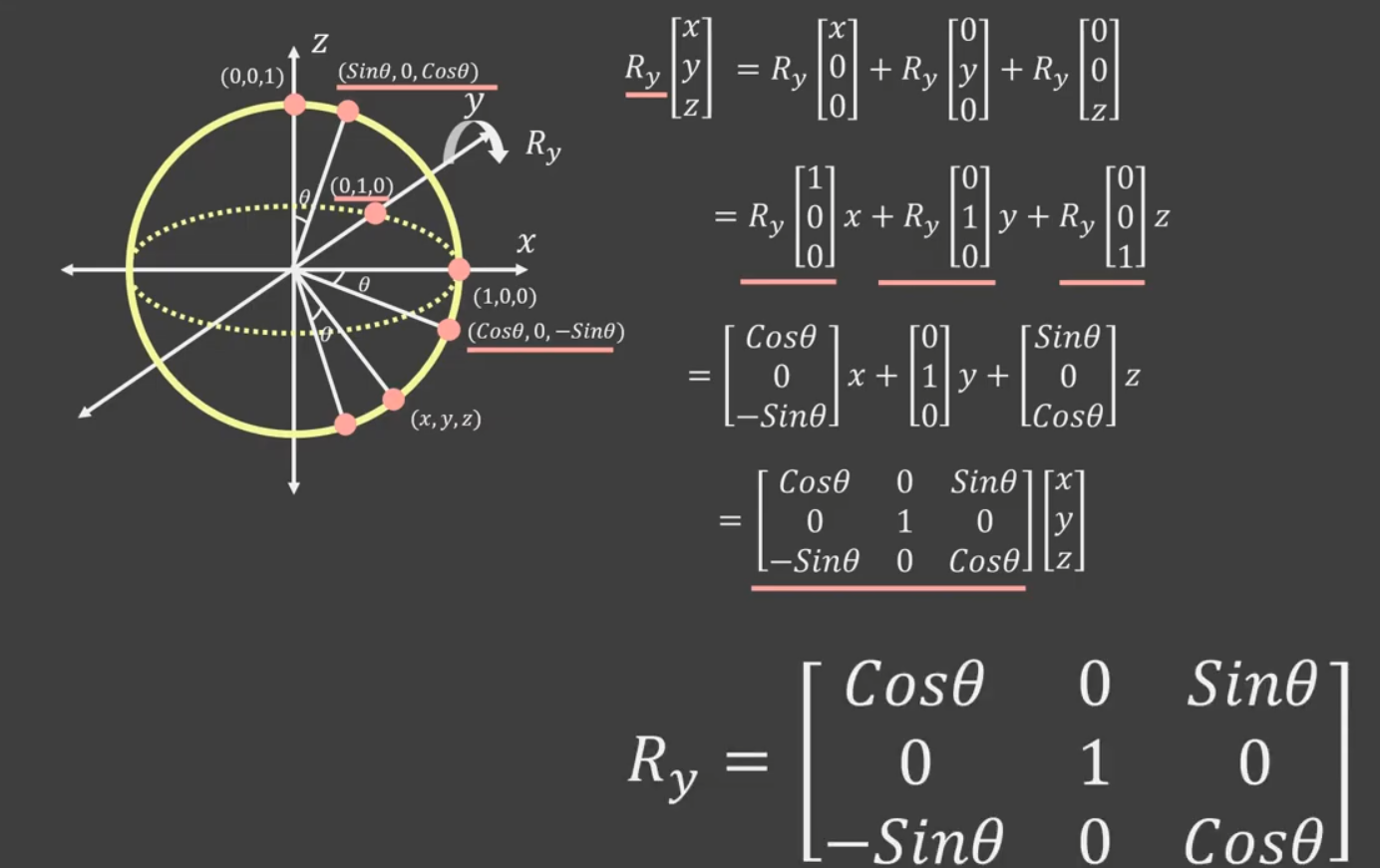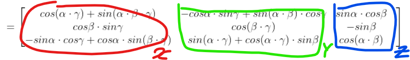 여기서 주목할 점은 x축과 z축의 회전은 우리가 알고있듰이 기적베터에 정상적으로 [(cosθ, sinθ), (-sinθ, cosθ)]만큼 회전이 적용된 것을 알 수 있다. 하지만, y축 기준의 회전은 [(cosθ, -sinθ), (sinθ, cosθ)]로 전치행렬의 모습을 띄고있다.