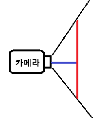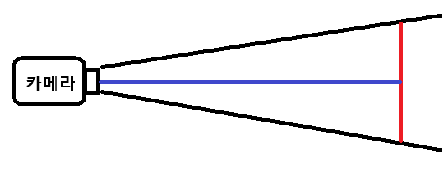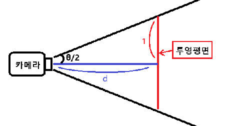 일단 투영평면의 위치는 위 아래 크기가 각각 1이 되는 지점으로 결정된다. 좌우, 상하가 [-1, 1]범위를 가지고있는 정사각형의 모습을 하고있으며 이 평면 위에 물체의 상이 맺히게 된다. 이러한 평면에 대응하는 정사각형 영역을 NDC(Normalized Device Coordinate)라고 부르고 이 NDC가 일정한 값을 가지려면 화각이 커질수록 초점거리는 가까워지고 화각이 작아질수록 초점 거리는 멀어지게 된다.