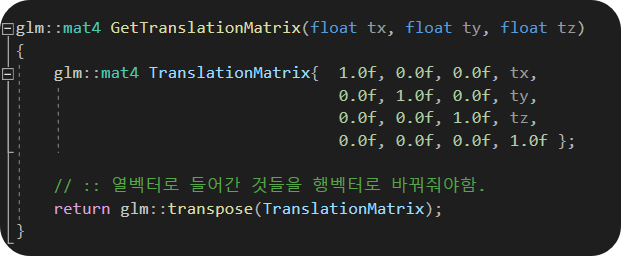 전치를 해줘야 비로소 우리가 원하는 이동 변환행렬이 나온다는 것을 알 수 있었다.