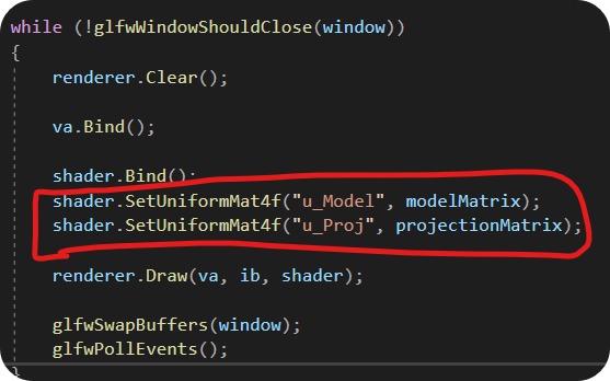 위와 같이 모델행렬과 원근투영행렬을 구해줬다면