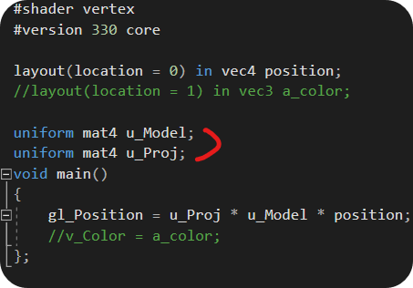버텍스 쉐이더 부분이다. 버텍스의 Position인 벡터 값에다가 앞서 구한 모델 행렬과 투영 행렬을 곱해줬다.