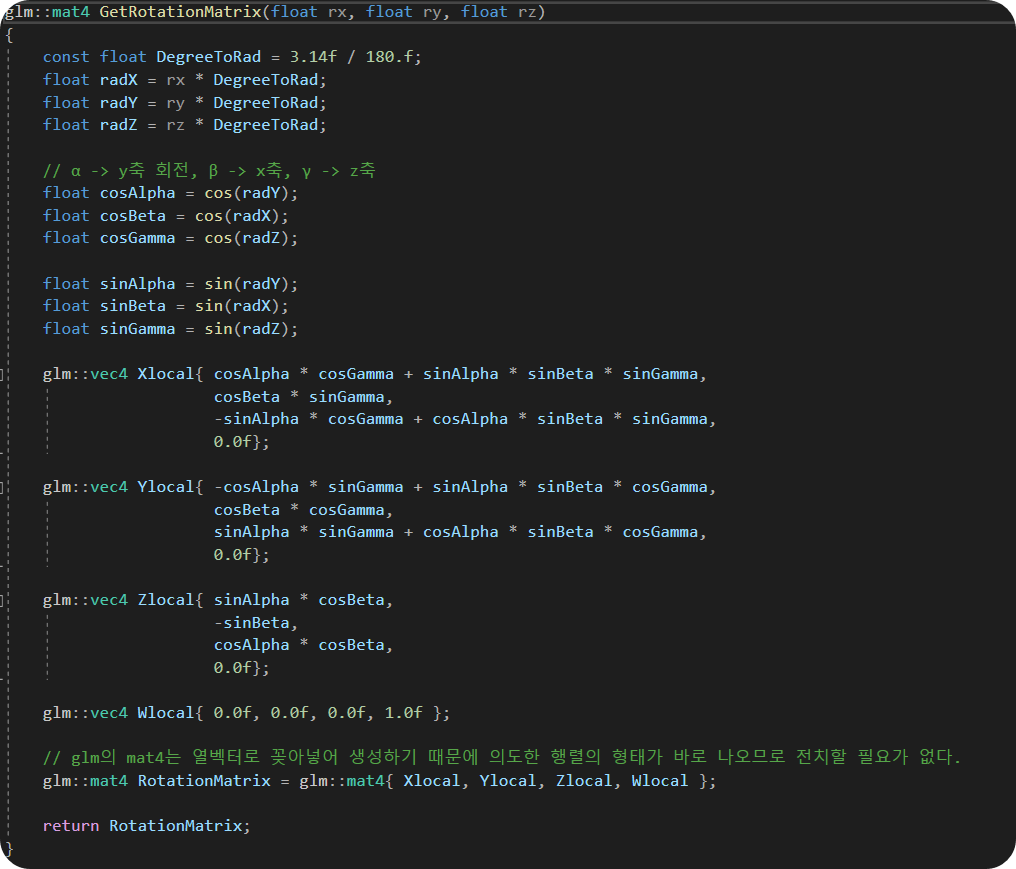 작동이 잘 되는 것을 확인했었으나, ChatGPT가 알려준 방식, glm의 라이브러리 속 Rotate 함수의 내용은 내가 했던 방식과 흡사하면서도 달랐다. 이에 대해서는 추후에 공부를 많이 해봐야겠다.
