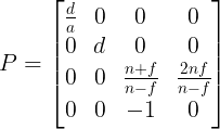 위 행렬에 최종적으로, 근평면과 원평면을 활용한, 깊이값을 넣은 원근투영행렬은 아래와 같다.