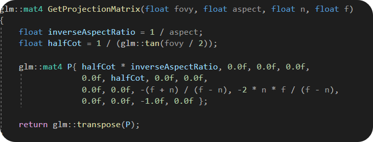 이를 토대로 코드를 구현해봤다. 원근투영행렬과 이동행렬은 전북대 교수님 강의를 따라 코드를 작성하며 이해를 한 뒤 다시 처음부터 제작해봤고 크기와 회전변환 행렬은 이전에 공부한 내용들을 토대로 스스로 구현해봤다.
