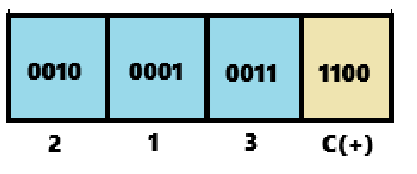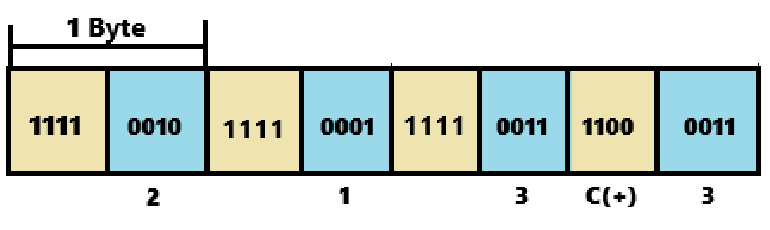 | (1) 존 영역은 항상 1111로 표시되므로 메모리를 낭비하므로 이를 제거한다. (2) 10진수 한 자리를 표현하기 위해서 존 영역 없이 4비트를 사용하여 표현한다. (3) 최하위 4비트에 부호를 표시한다. (양수면 1100, 음수면 1101) ![]() (ex. +213의 예. 만약에 -213이라면 마지막 4비트는 1101인 D가 되어야 한다) |