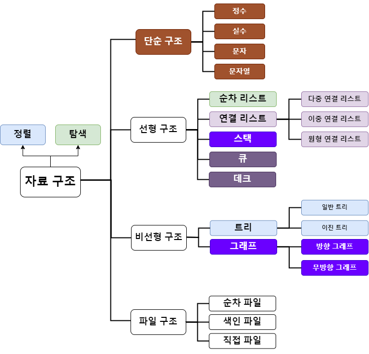 아래는 자료 형태에 따라 분류한 자료구조의 종류를 draw.io홈페이지를 이용하여 표현해봤다.
