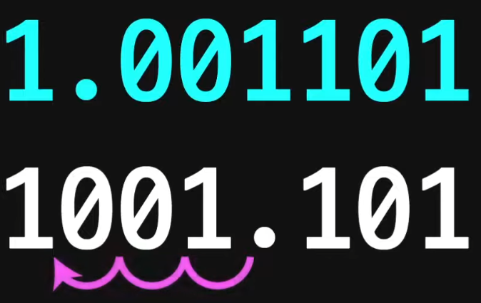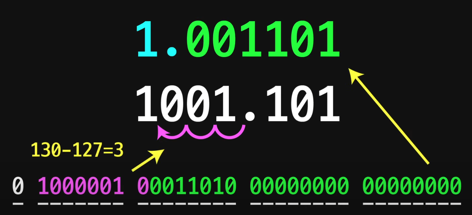 (ex. 9.625 = 1001.101, -> 1.001101 (floating point))