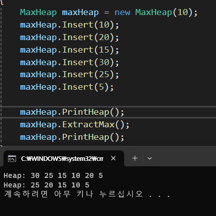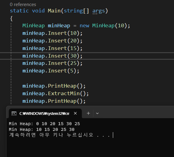 MaxHeap과 대부분 동일. Insert와 Extract 메서드의 내용이 다름