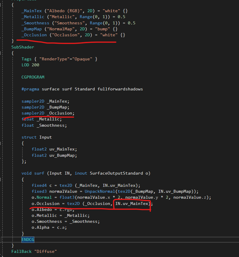 Occlusion은 개별 uv를 받으면 에러를 뱉어내므로 위와 같이 기존에 사용하고있는 텍스처의 uv를 가져다 사용해야한다.
