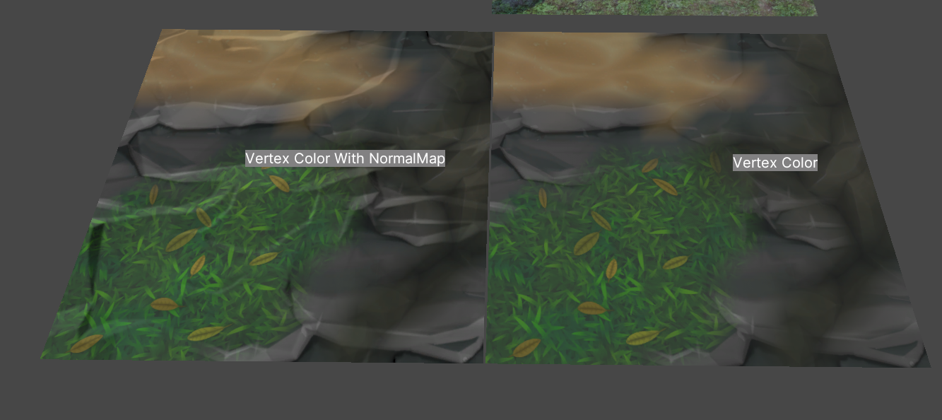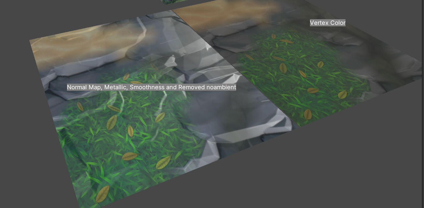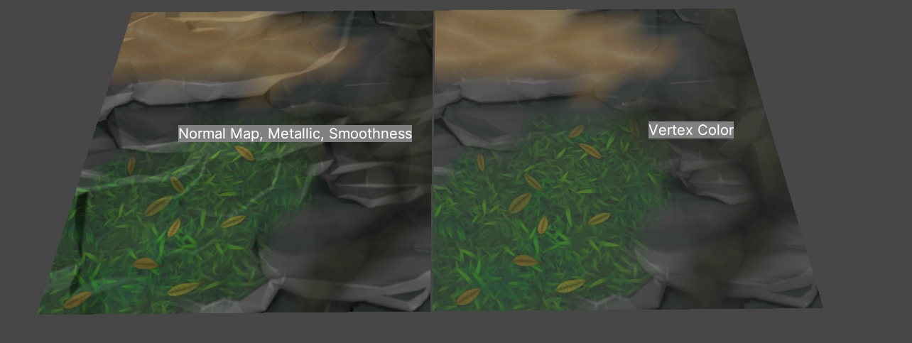 r(풀), g(모래), b(화산암) 채널들을 제외하고 배경(돌)에만 Smoothness를 적용하였고 이는 아래와 같이 눈속임으로 땅이 젖는 듯한 효과를 낼 수 있었다.