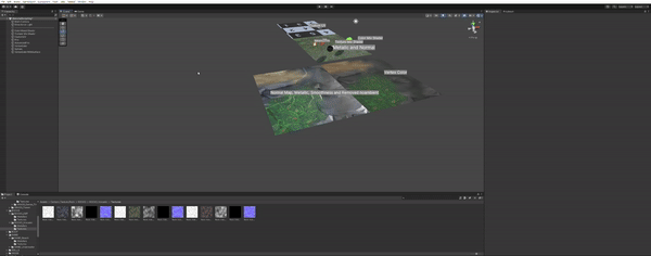 위 gif는 설정값 metallic 0, smoothness 0.5를 기준으로 녹화했다. smoothness가 모래, 풀 등에도 적용을 받고 있기 때문에 어색해보인다. 바위 (리소스가 있었다면 벽돌로 했을텐데 아쉽)에만 적용이 되도록 변경하였다.
