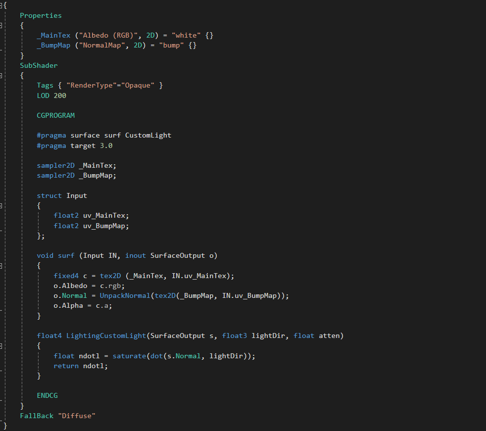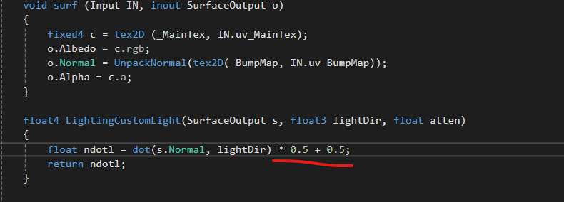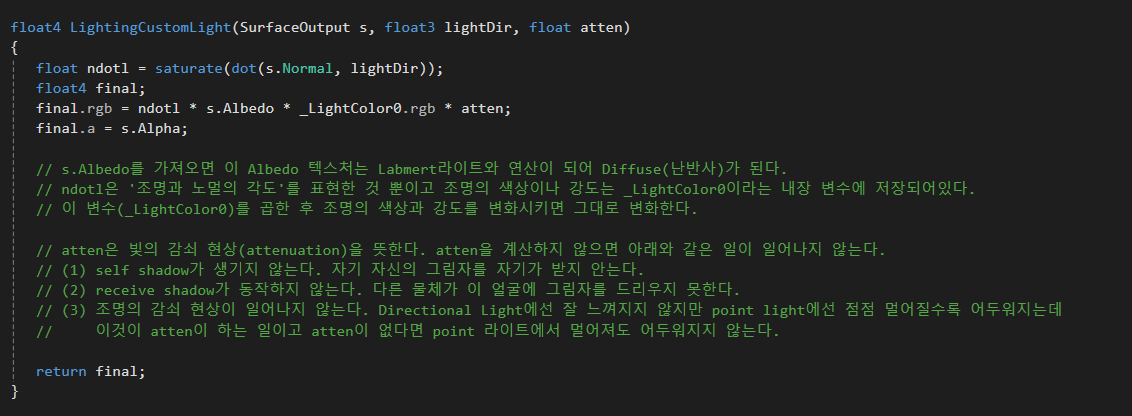 LightingCustomLight함수를 본다면 ndotl 함수에 saturate함수를 적용한 것을 볼 수 있다.