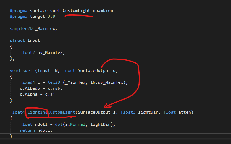 이전까지 스니핏(snippet)에 #pragma surface surf Standard 와 같이 'Standard'라는 지시어로 어떠한 라이트 구조를 사용하는지 명시했었다. 여기에는 Lambert, BlinnPhong, Standard의 키워드가 대표적으로 들어갔는데 이들을 제외하고 커스터마이징한 라이팅 구조를 쓰고싶다면 아래와 같이 고쳐주면 된다.