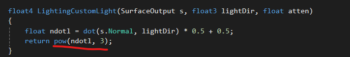 void surf 함수 아래 float4를 반환하는 LightingCustomLight함수가 보일 것이다. CustomLight함수 이전에 'Lighting'키워드가 중요하다. 이는 surf함수 이후에 Light 함수를 정의하는 것인데 "Lighting + 커스터마이징 구조의 이름" 형식을 따르면 된다.