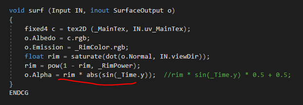 시간에 따라 없어졌다 생겼다하기 위해 아래와 같이 sin함수에 time 매개변수를 넘겨주고 이를 모든 음수를 양수처리하여 그래프가 통통 튀는 느낌이 들게끔 하기 위해 절대값 함수(abs)를 사용하였다.