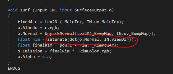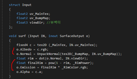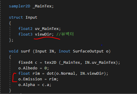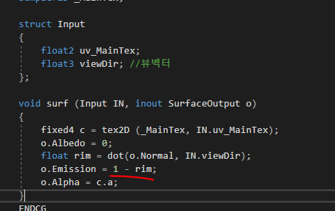 먼저 우리가 엔진에 내장되어 받을 수 있는 변수 중 viewDir인 뷰벡터 [카메라 벡터]를 얻어온다. 우리는 앞서 배운 ndotl [램버트 공식]에서 조명에 따른 노멀의 내적이 아니라 뷰벡터에 따른 노멀의 내적인 ndotv로 변경하고자 한다.