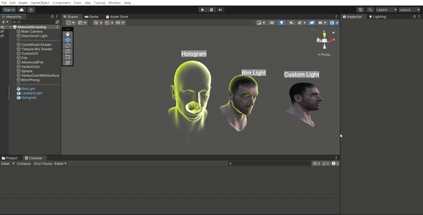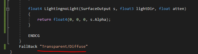 홀로그램은 마치 이펙트와 같은 쉐이더이기 때문에 그림자를 생성할 필요가 없다. 그러므로 Fallback "Diffuse"를 Transparent계열의 쉐이더로 변경하였다.